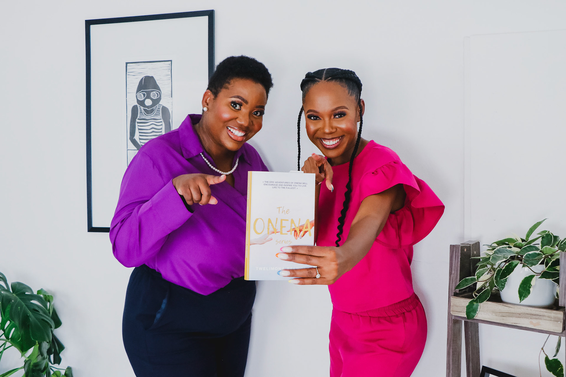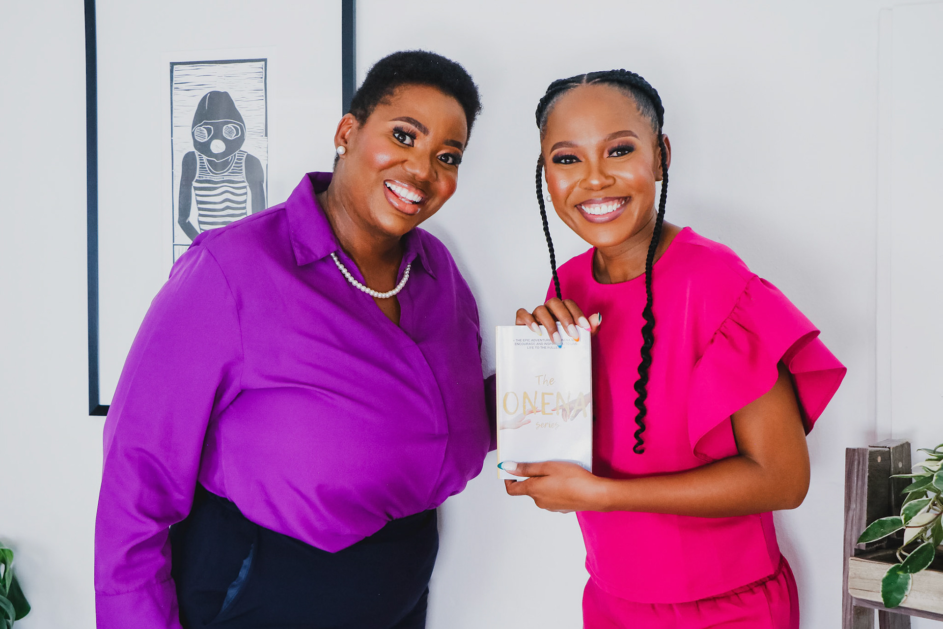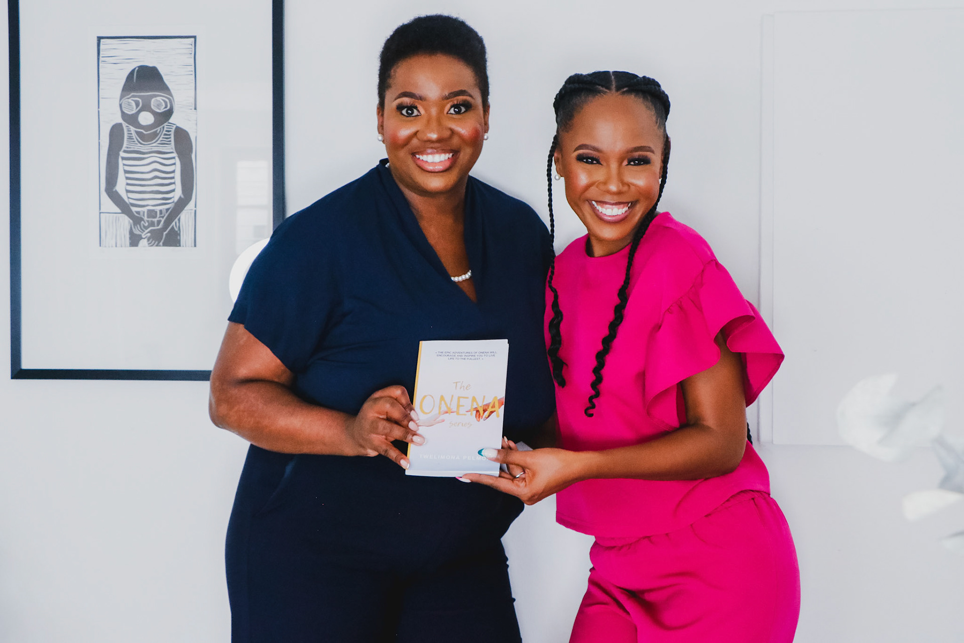 Photos featuring: Twelimona Pelmont (Author) (in blue) and Charmain Shalumbu (In pink) (Event host).